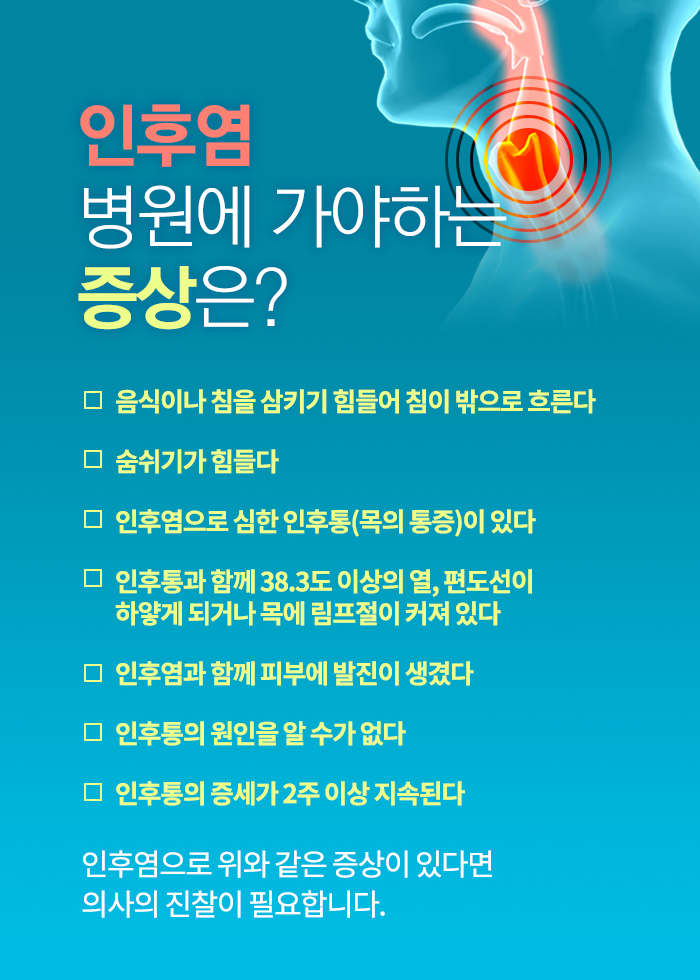 - 목의 통증: 목이 따끔거리거나 아픈 느낌, 때때로 통증이 심해져 음식을 먹기 힘든 경우도 있습니다.