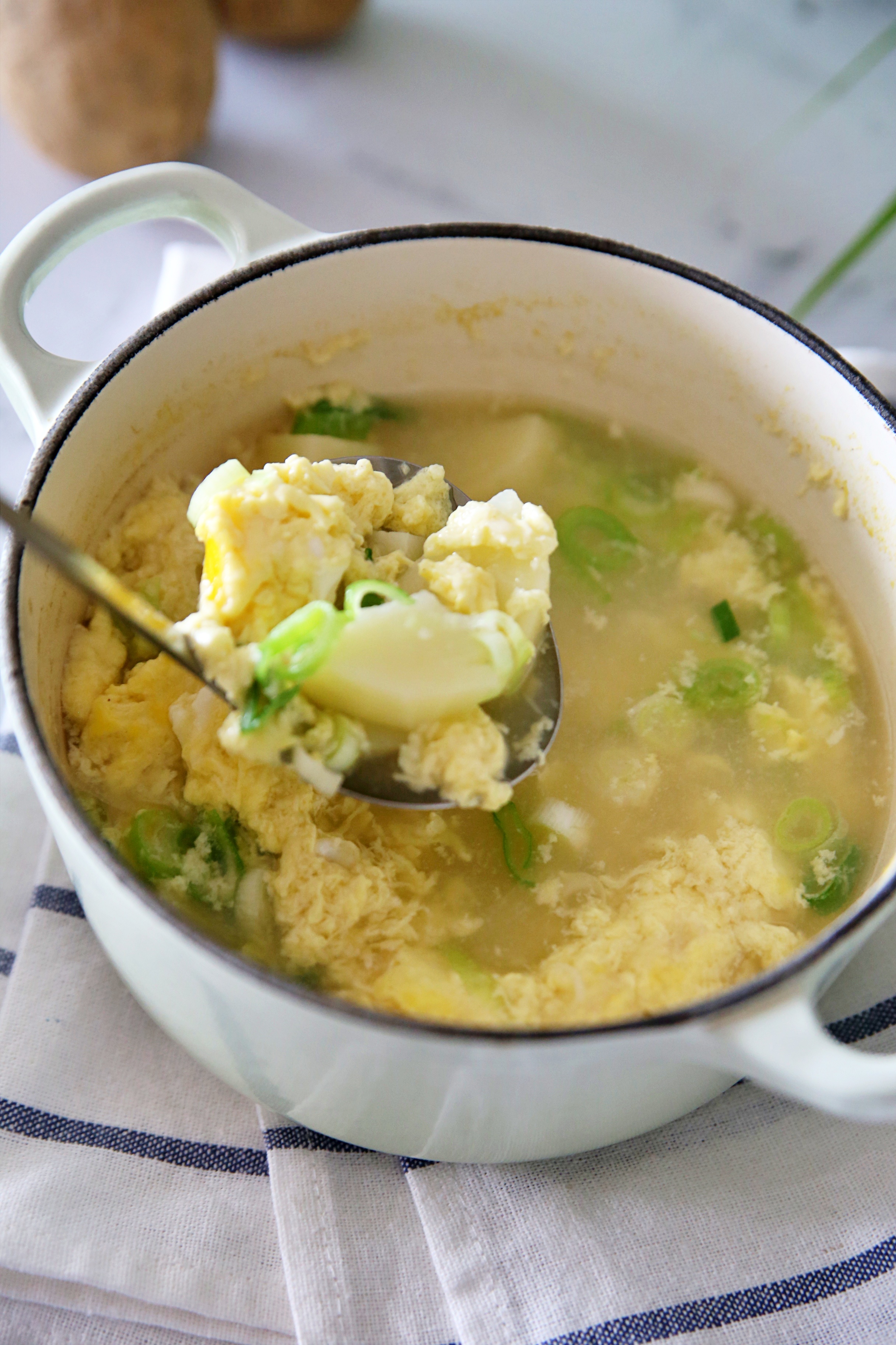 - 계란을 국물에 넣고, 약한 불에서 살살 저어주면 됩니다. 이때 계란이 고루 퍼지도록 저어주는 것이 관건입니다. 때때로 푼 계란이 익는 모습을 지켜보는 것이 요리의 즐거움이기도 합니다.