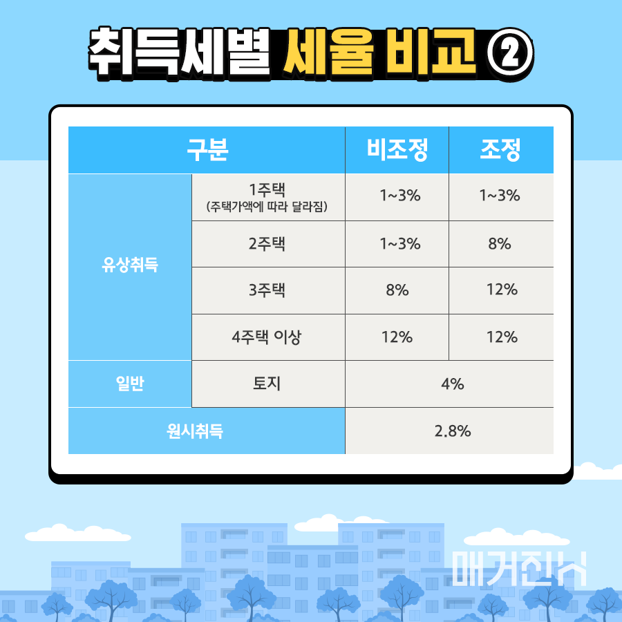 취득세는 부동산을 구매할 때 발생하는 세금으로, 매매가를 기준으로 부과됩니다. 한국에서는 취득세의 세율이 다소 복잡한데, 보통 1~3%의 세율이 적용됩니다. 다주택자의 경우, 추가 세금이 부과될 수 있습니다. 이러한 상황에서는 먼저 자신의 세율을 파악한 후 정확한 세금 계산을 진행해야 합니다.